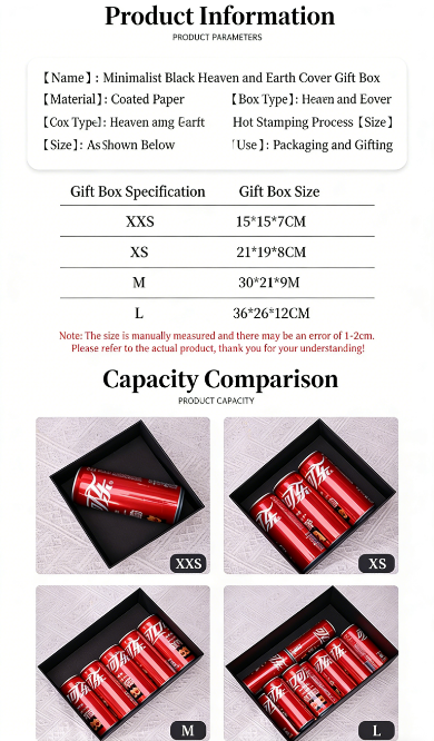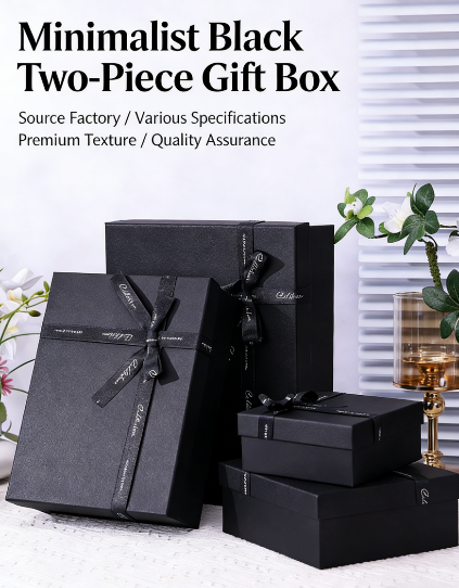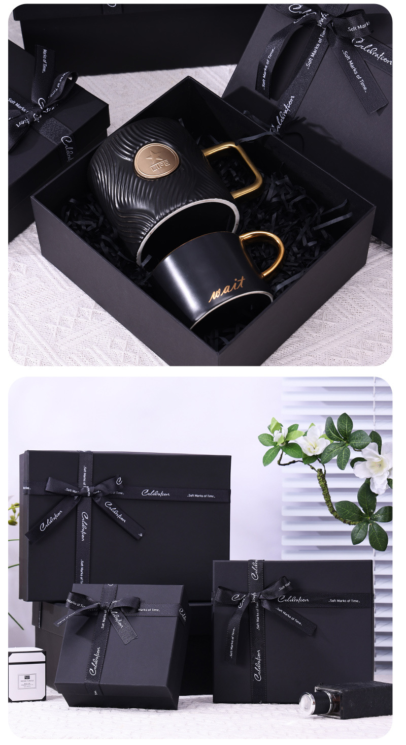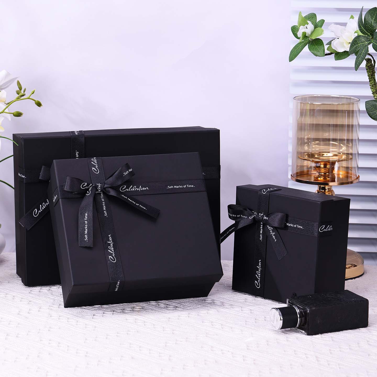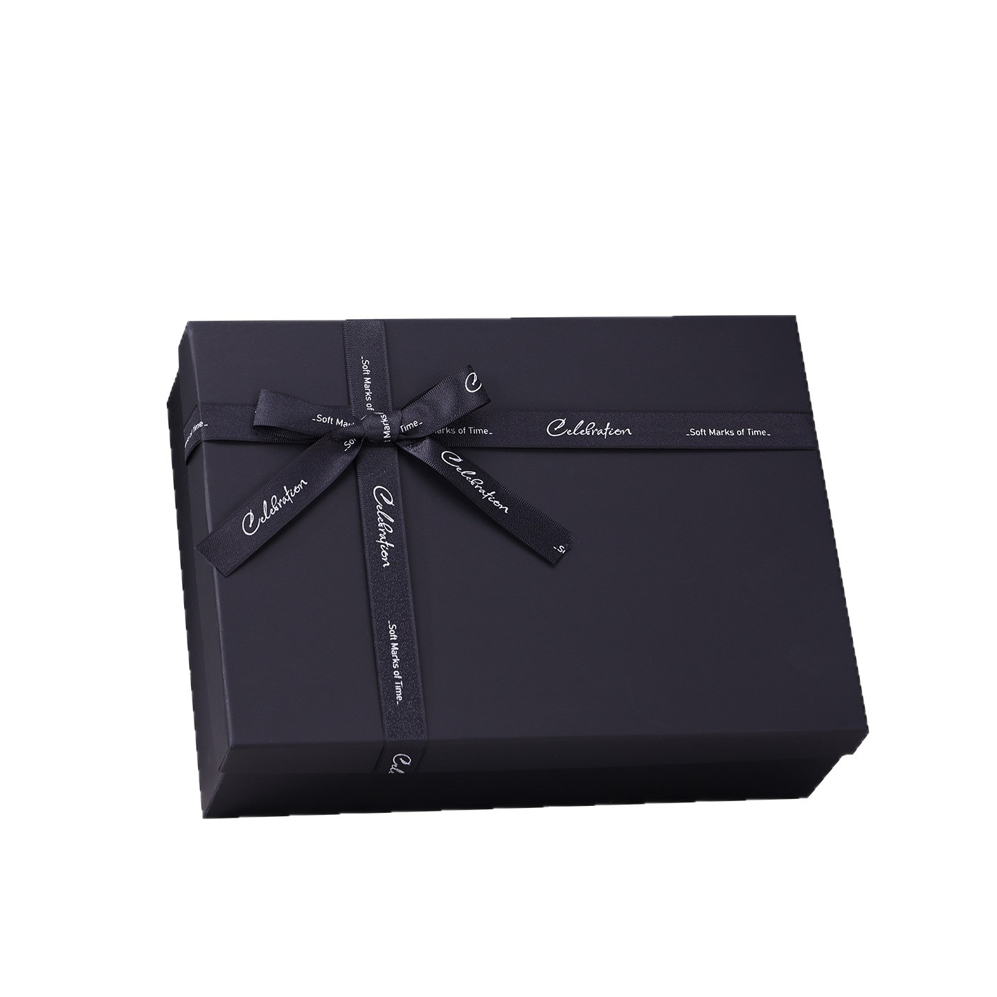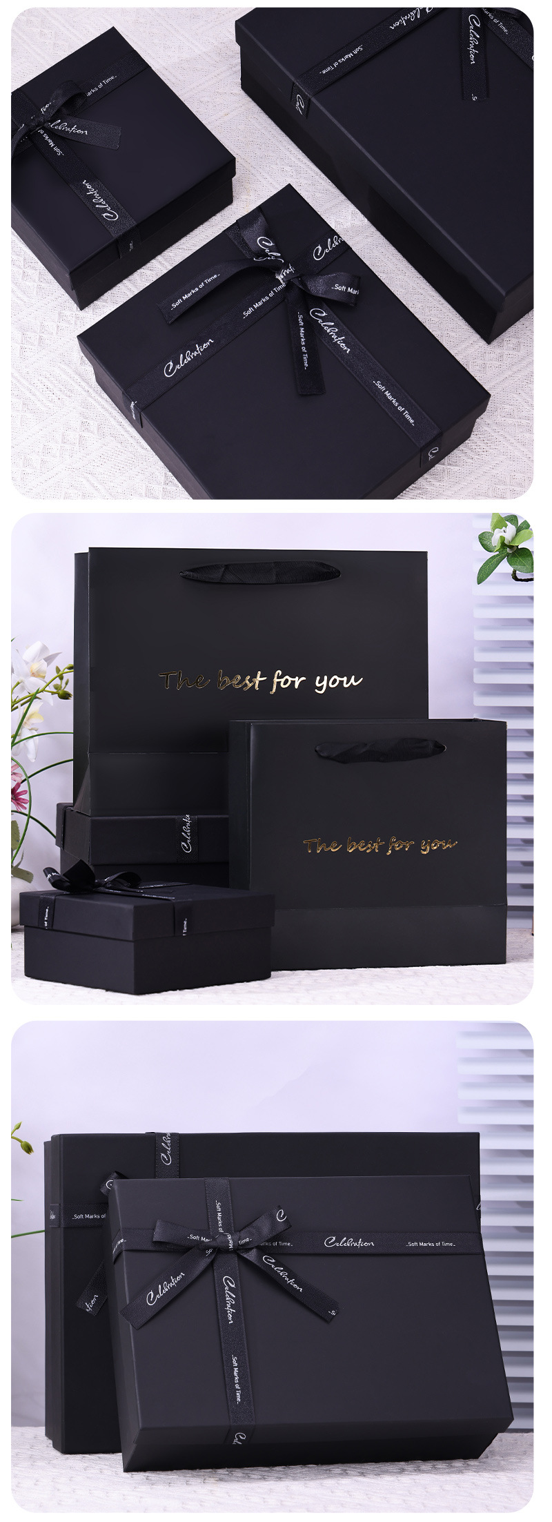 Minimalist black box for gift wrapping Match with the same style gift bag Having gold stamping technique Exquisite strap decoration