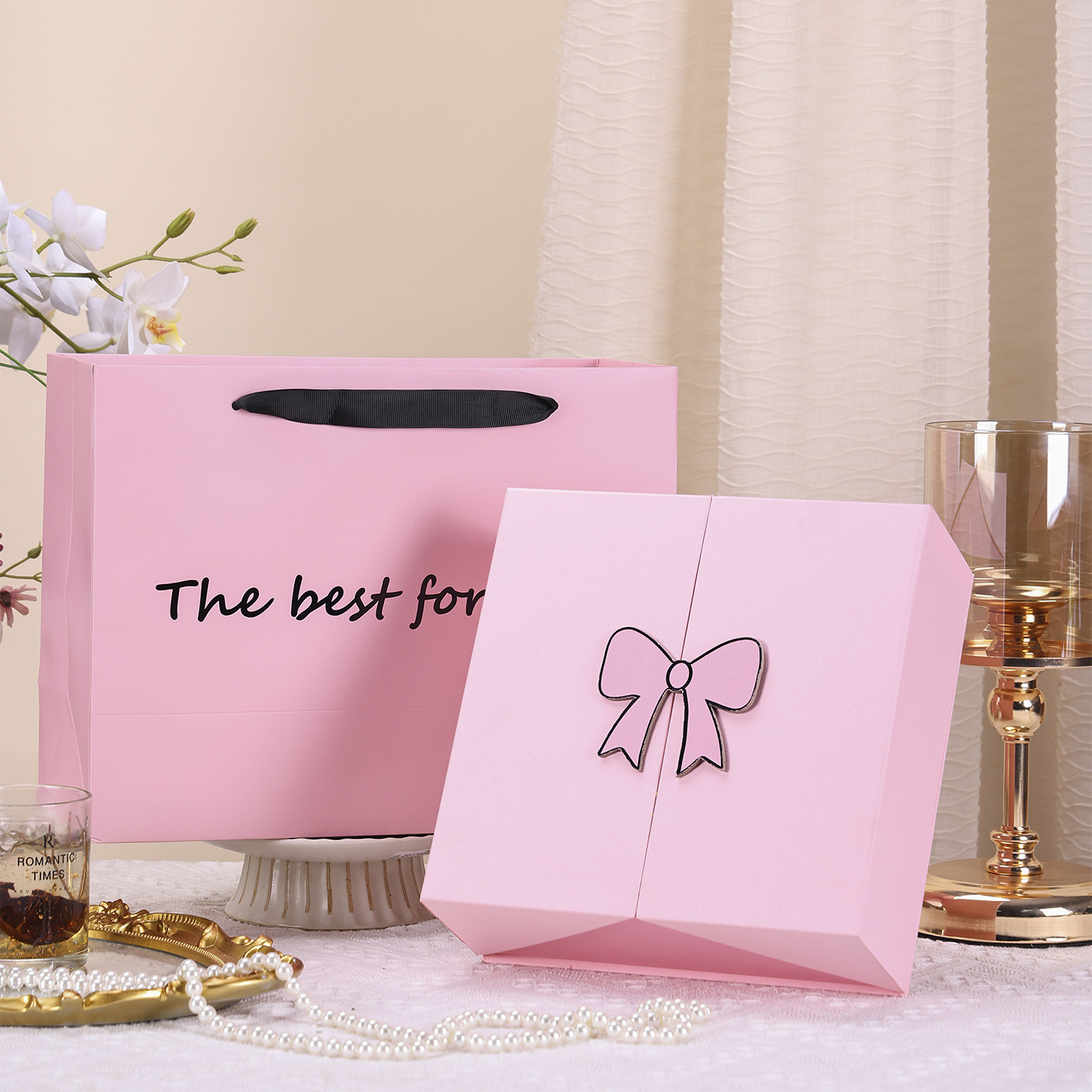 Pink bow ribbon gift box for jewelry, cosmetics, perfume and lipstick, storage box, gift box